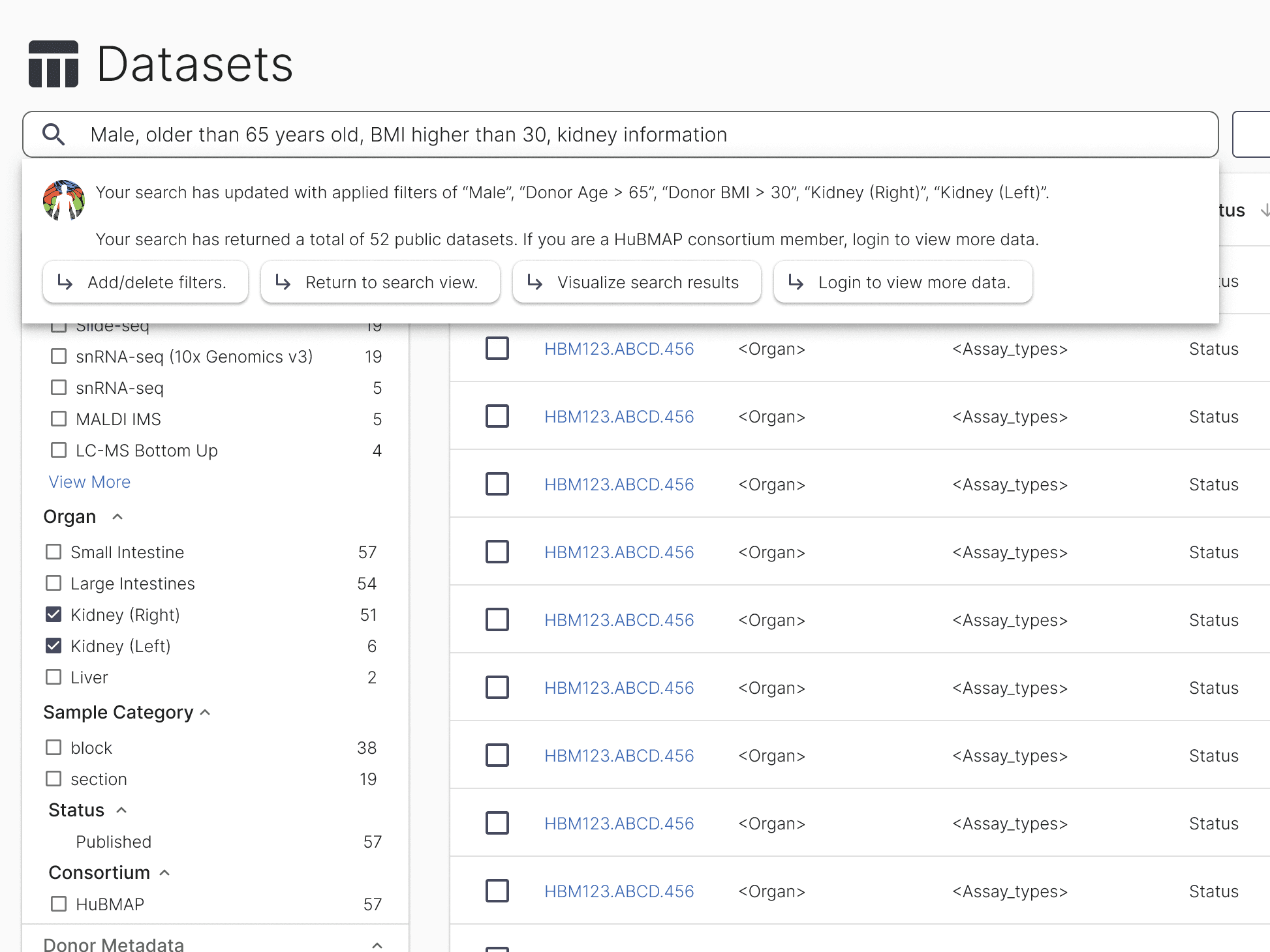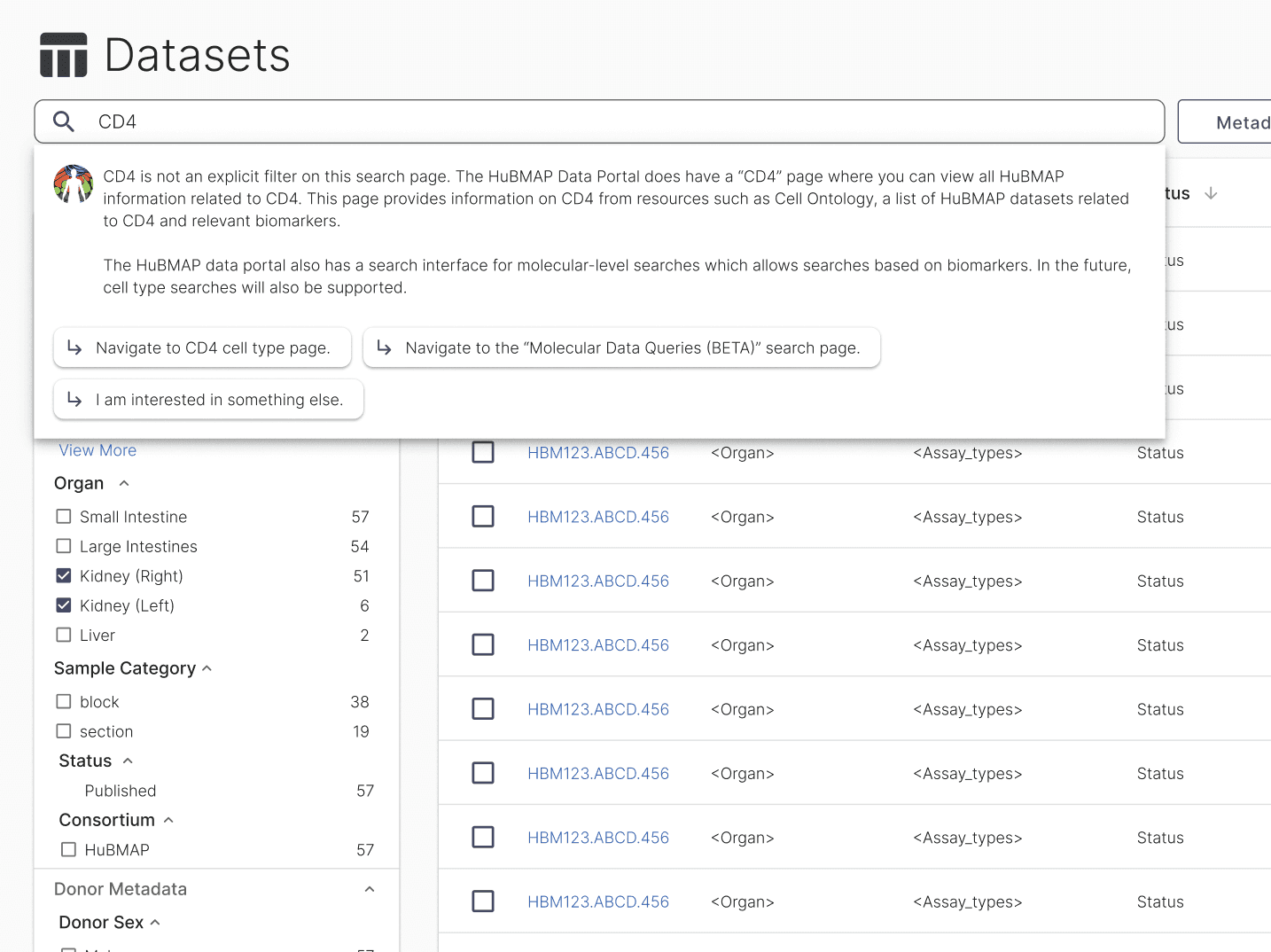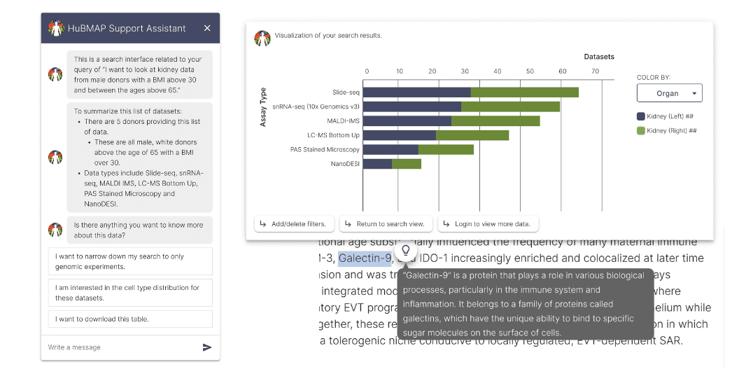 To address these gaps, I explored three LLM-enabled experiences that would lower the barrier to insight and make HuBMAP more accessible, intuitive, and context-aware.