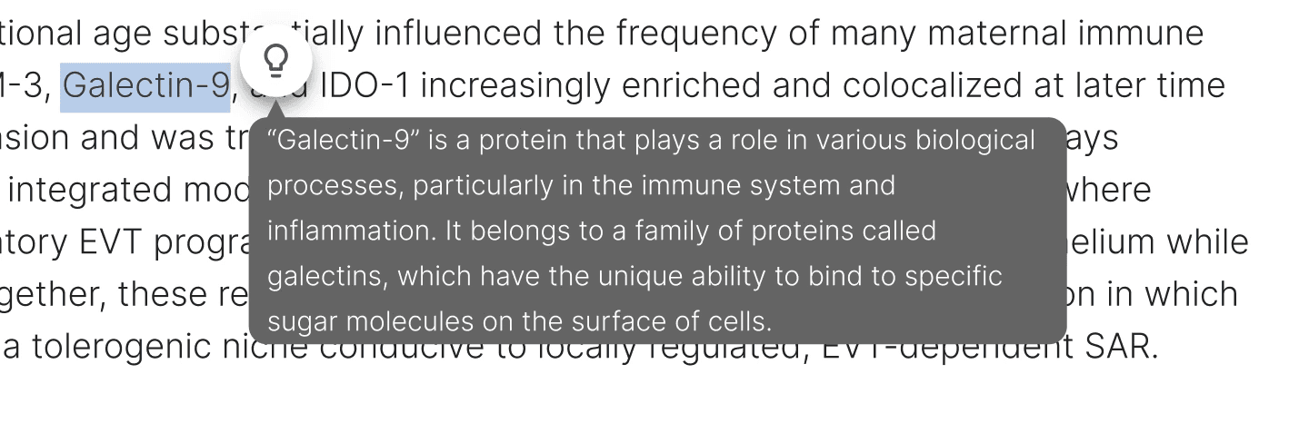 When a user hovers over a complex term (e.g., snRNA-seq, CD markers), AI generates: