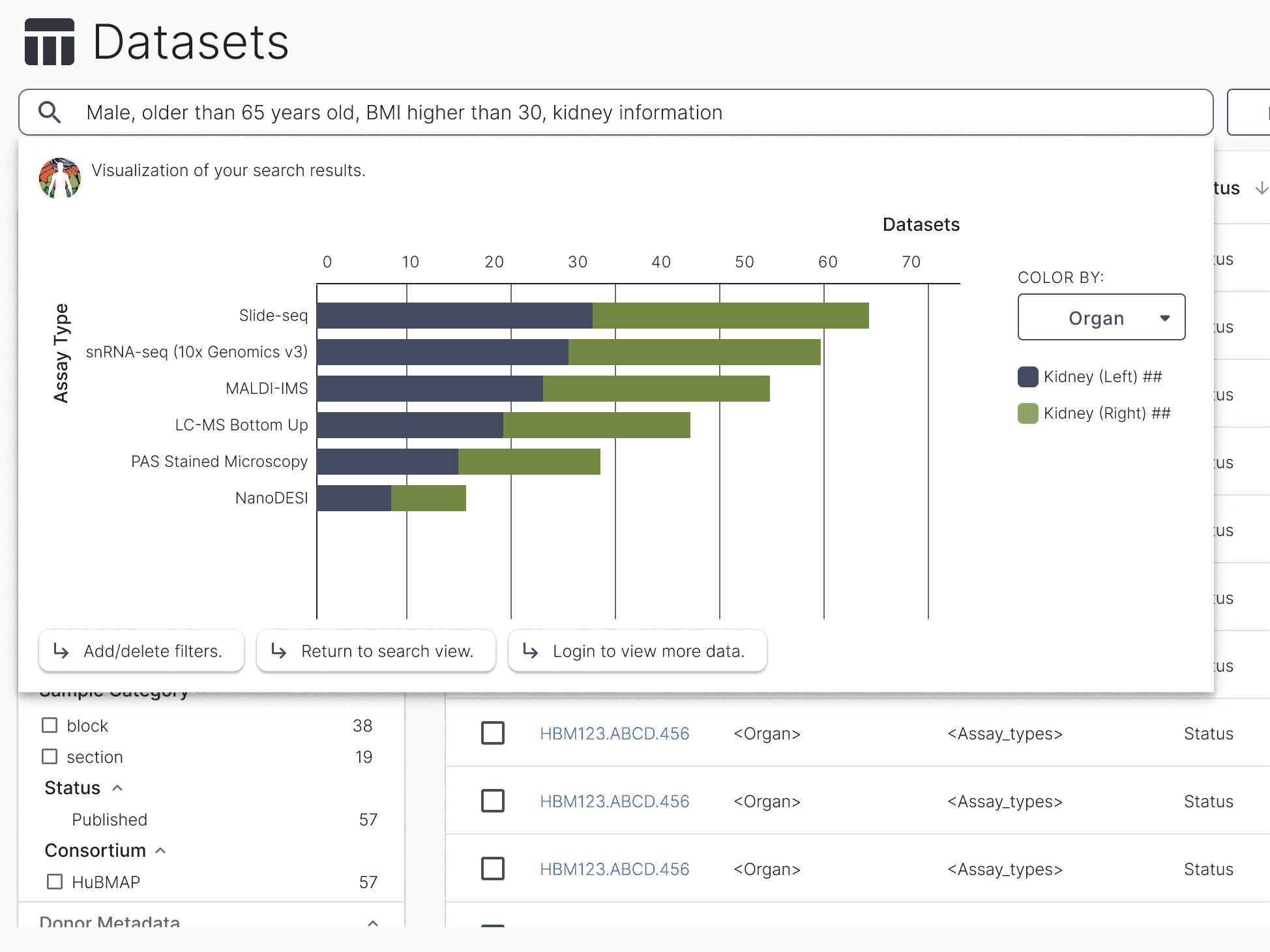 Existing search is exact-match and dependent on metadata filtering. Generative Search AI enables semantic, biological, and goal-oriented search by interpreting natural-language queries and converting them into structured filters. It can also automatically generate visual summaries—such as assay distributions or organ-level comparisons—based on the user’s query, helping researchers understand results at a glance.